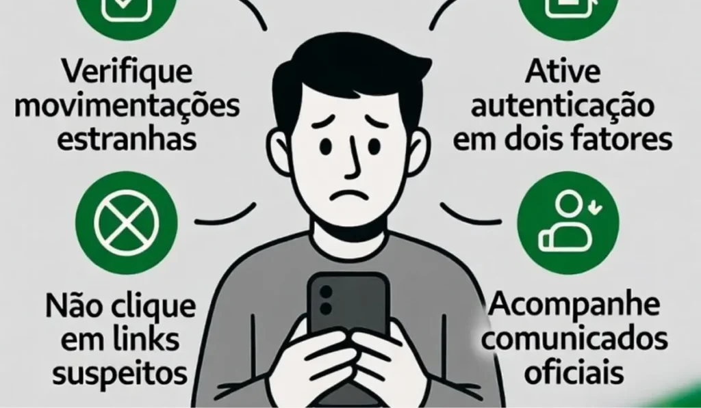 Fique atento a movimentações estranhas na sua conta. Qualquer coisa que você não reconheça, informe ao banco imediatamente. Não clique em links suspeitos que prometem resolver problemas bancários. Ative a autenticação em dois fatores sempre que possível. Desconfie de contatos inesperados pedindo seus dados bancários – banco nenhum faz isso por telefone ou WhatsApp.